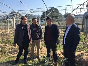 12月28日,常务副院长张国平带领农业技术推广中心副主任袁康培、土壤肥料专家石伟勇教授、水果专家贾惠娟教授等技术骨干一行6人,不远千里,来到国家级贫困县―忻城对接,考察当地农业主导产业,在县长李朝晖陪同下,走访了特色农业薰衣草庄园和蓝莓山庄,一路下田埂,“钻”林地,观察百香果生长,诊断病害,为企业负责人示范讲解技术要点,及合理施肥、避免冻害、安全过冬等管理措施。