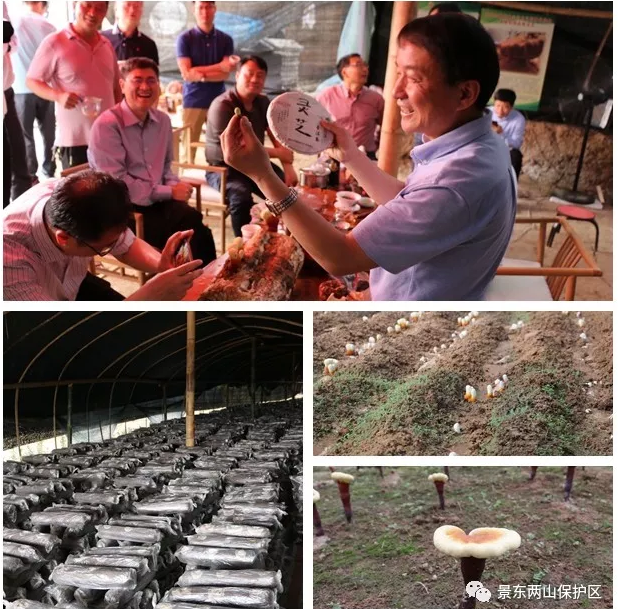 浙江大学定点帮扶野生菌项目积极践行“大学+政府+龙头企业+合作社+基地+农户”的“六位一体”扶贫模式,建立了以浙江大学首席专家为主要科技支撑,以浙江大学景东野生菌资源研发中心为主要责任主体,成立景东绿宝灵芝种植农民专业合作社,建立生态灵芝栽培示范基地,带动贫困户共同实施产业扶贫。从2016年到2019年,先后在景东县文井镇中所村、锦屏镇景范村等地建立了5个生态灵芝栽培示范基地,合计栽培面积约140亩,生产灵芝约70吨,灵芝孢子粉约50吨。