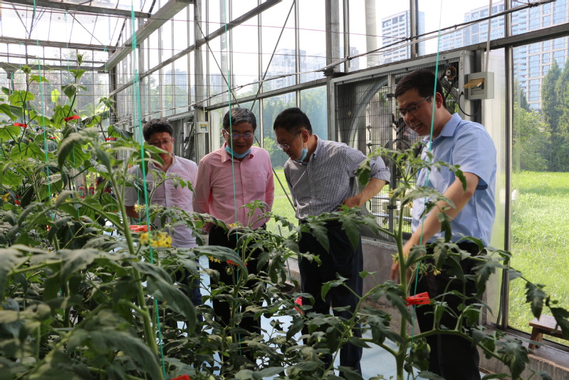 现场会由课题负责人陈利萍教授主持。咨询专家实地考察了喻景权教授团队研发的果菜高效节能LED补光技术、低温下果菜光合抗性双增技术、新一代轻简自控无土栽培系统,陈利萍教授团队研发的基于枸杞嫁接的番茄长季节栽培新模式,卢钢教授团队研发的基于基因编辑技术创新番茄高产新种质。专家及课题骨干成员仔细查看了试验区块番茄植株的实际生长情况,就相关问题进行了交流讨论,对农业试验站在项目研究中的设施条件、实验技术支撑给予了肯定,并积极评价项目试验中的栽培管理工作。