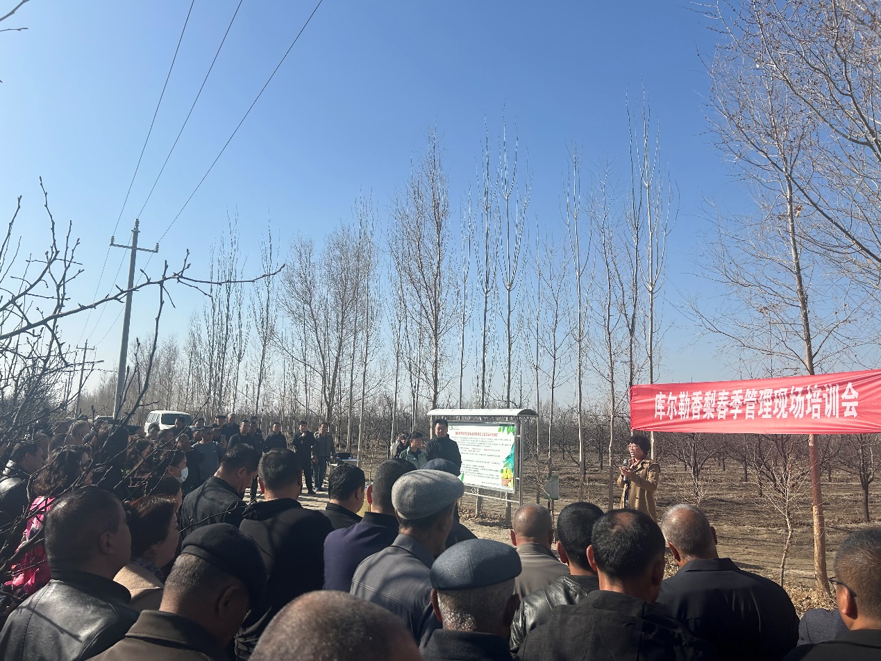 三月底的南疆气温回暖,香梨花芽开始萌动,香梨上的重要病害枝枯病的防控工作迫在眉睫。受新疆维吾尔自治区巴音郭楞蒙古自治州林业和草原局的邀请,我院楼兵干老师于3月27日-29日为巴州库尔勒市、尉犁县、轮台县和第二师铁门关市连续开展了四场苹果枝枯病关键防控技术的培训,巴州市领导、行业主管部门领导、各乡镇分管领导、技术干部和果农及种植大户等共计400余人参加培训,培训深受欢迎,取得圆满成功。