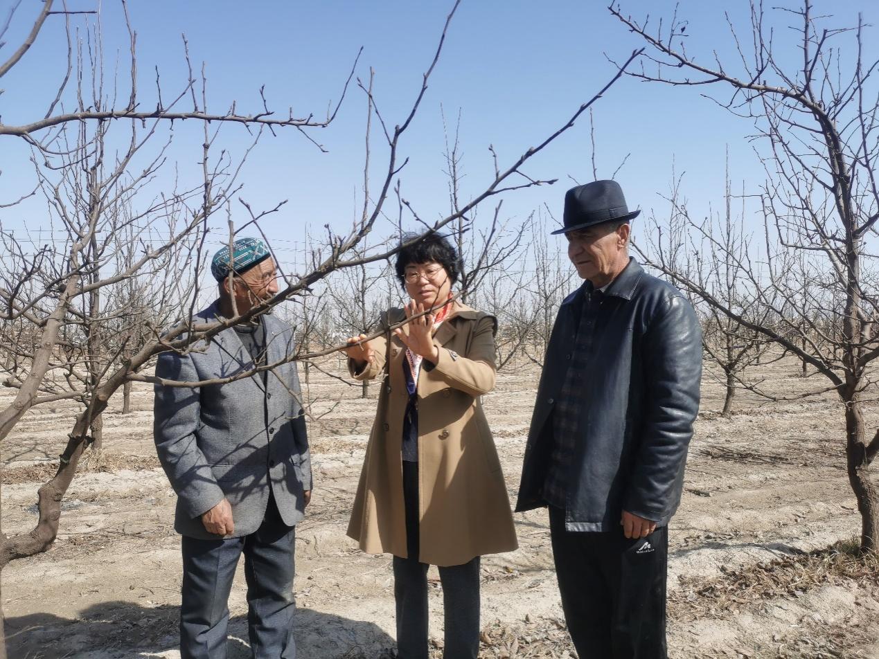 在果园为维吾尔族同胞讲解病枝修剪技术