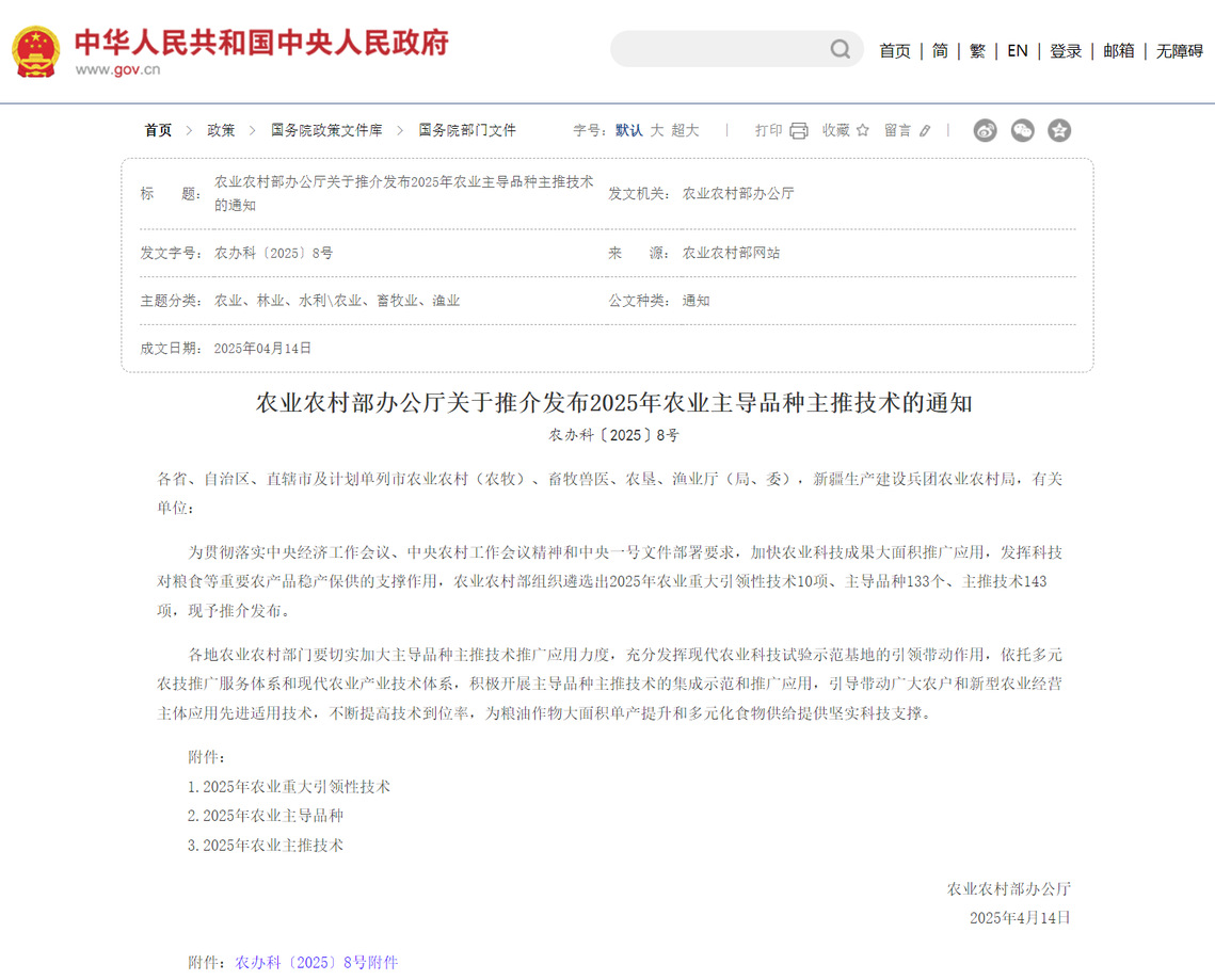 根据近日发布的《农业农村部办公厅关于推介发布2025年农业主导品种主推技术的通知》(农办科〔2025〕8号),由我校团队主导的“柑橘优质生产和采后适温冷链物流技术”入选农业农村部2025年农业主推技术。