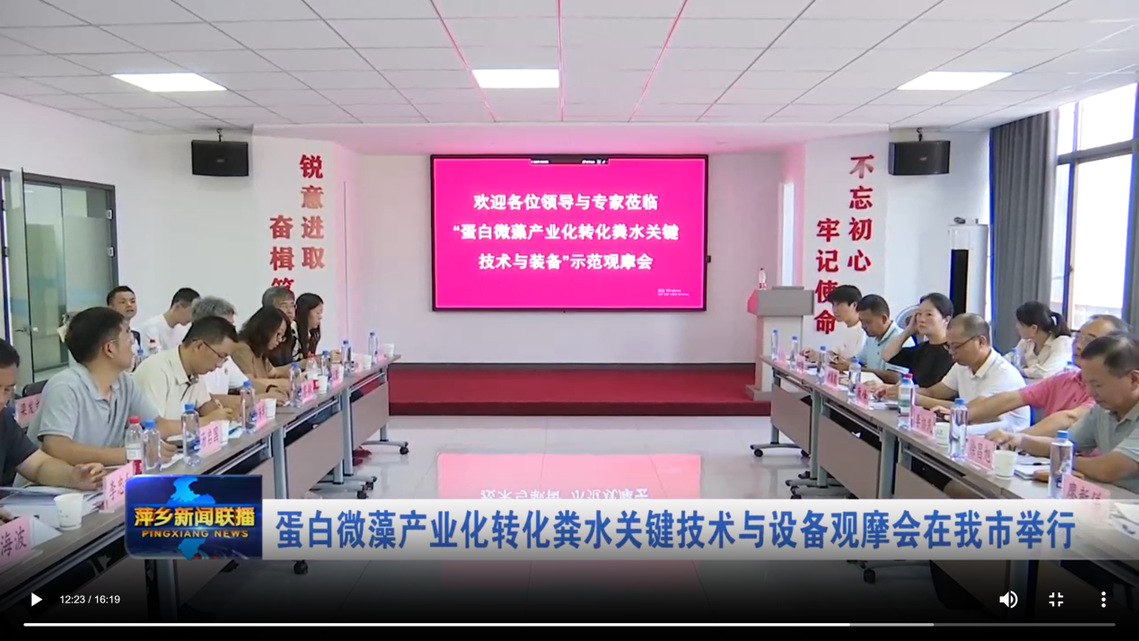 该技术紧紧抓住了国家需求及行业痛点,基于粪污液的养分含量高的特征,首次开发了养殖污水规模化蛋白微藻(小球藻)及硅藻高值转化利用技术与装备,实现了养殖污水氮磷资源高效转化与CO₂固定及高值化的协同,产出的微藻产品在材料、水产、医药、农业、环保等领域应用面广,为养殖污水高值化与资源化提供了新途径,有助于促进基于粪污液资源的微藻生物合成产业的形成,生态效益与经济效益显著。观摩会被萍乡市电视台报道。